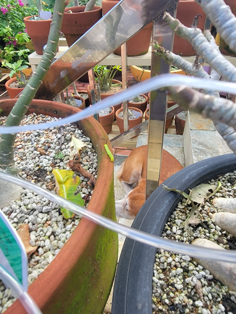 Here is another picture with one on the terracota pot and if you look to the left you will see another sitting on the leaf after it was chewed down. The silver stuff is Christmas lights and not catepillar roadways.
